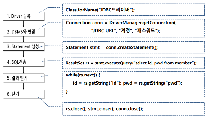 JDBC API는 java.sql, javax.sql 에서 Java의 표준 API로 제공되지만 JDBC드라이버는 연동하려는 DB 서버에 알맞은 것을 추가로 준비해야 한다.