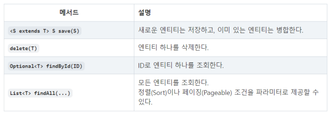 나의 엔티티 객체를 위한 repository 인터페이스를 '엔티티클래스명Repository'명으로 JpaRepository를 상속하여 개발