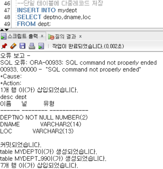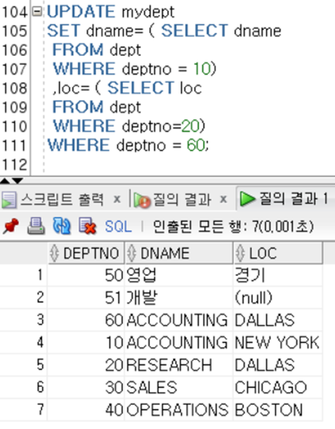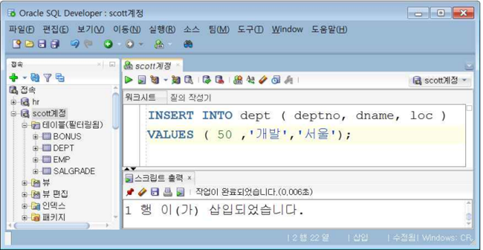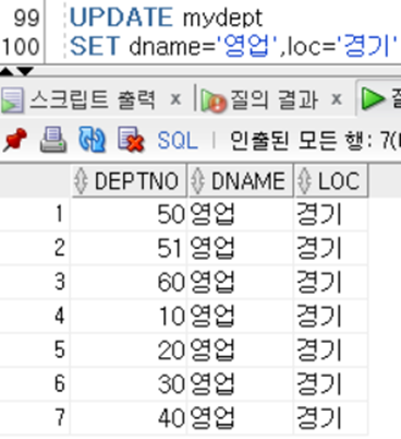 모든 DML을 수행할경우 Table을 보여주는것이 아닌 ACTION뒤에 몇개 행이 삭제, 수정, 삽입 되었는지 표기되고 Python, jave에서 데이터를 긁어올 때도 동일하므로 잘 참조하여야 한다.
