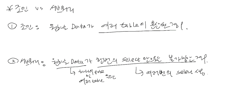 Subquery 역시 분산된 데이터를 취합하기 위해 사용되는 문법이나 JOIN과 다른 목적으로 사용되게 된다.