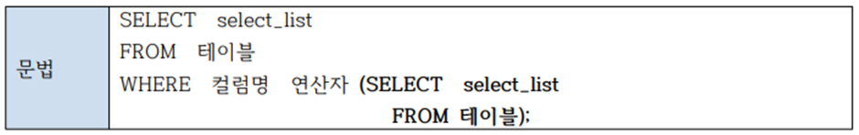 모든 Subquery문은 ()안에 새로운 select문으로 작성되어진다. (괄호가 없는 select문은 main query라고 칭한다.)