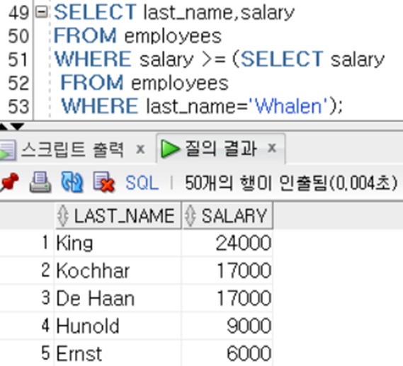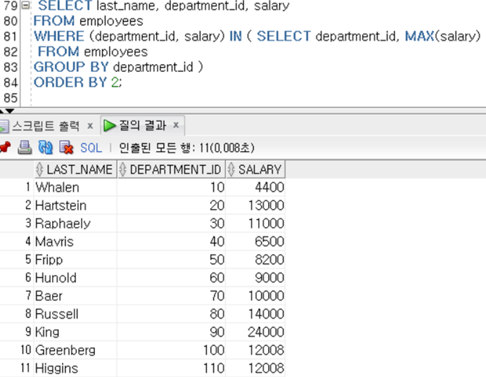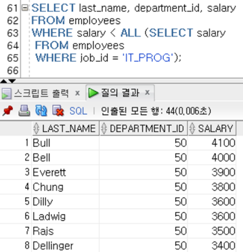 그러기에 단일행 subquery와 다르게 비교연산자가 아닌 IN,ANY,ALL,EXIST 연산자를 사용한다.