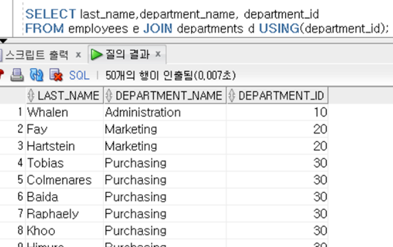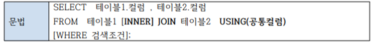 Natural join과 동일하게 equi join의 역할을 하지만 만일 공통컬림이 2개 이상이라면 Natural Join을 사용하지 못하기에 Using절을 사용해주어야 한다.
