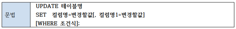 변경하고자 하는 조건은 Where 절에 명시하며 명시하지 않을시 모든 record를 변경하므로 명시하는 것이 권장된다.