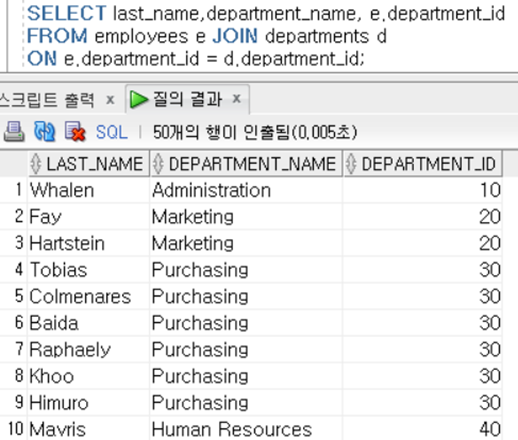 Equi join과의 차이점은 Where절이 아닌 From절에 join 문법을 입력한다는점, 그리고 join할 column을 따로 입력하지 않는다.