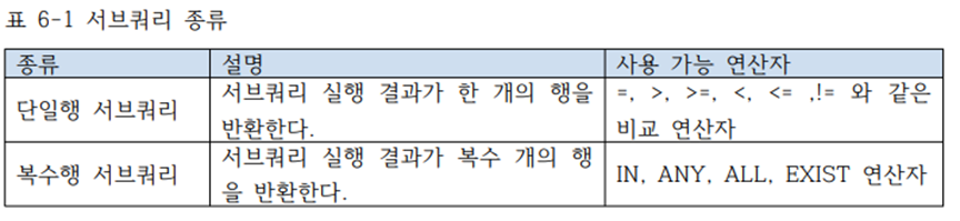 Subquery의 반환값으로는 단일 record와 복수 records가 나올 수 있는데 이에 따라 사용되는 연산자 혹은 Main query의 구성요소가 달라지니 주의하여야 한다.