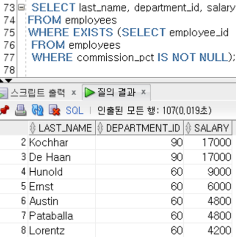 즉, EXIST()의 subquery문장에 값이 발생하면 mainquery 실행, 발생하지 않으면 실행x.